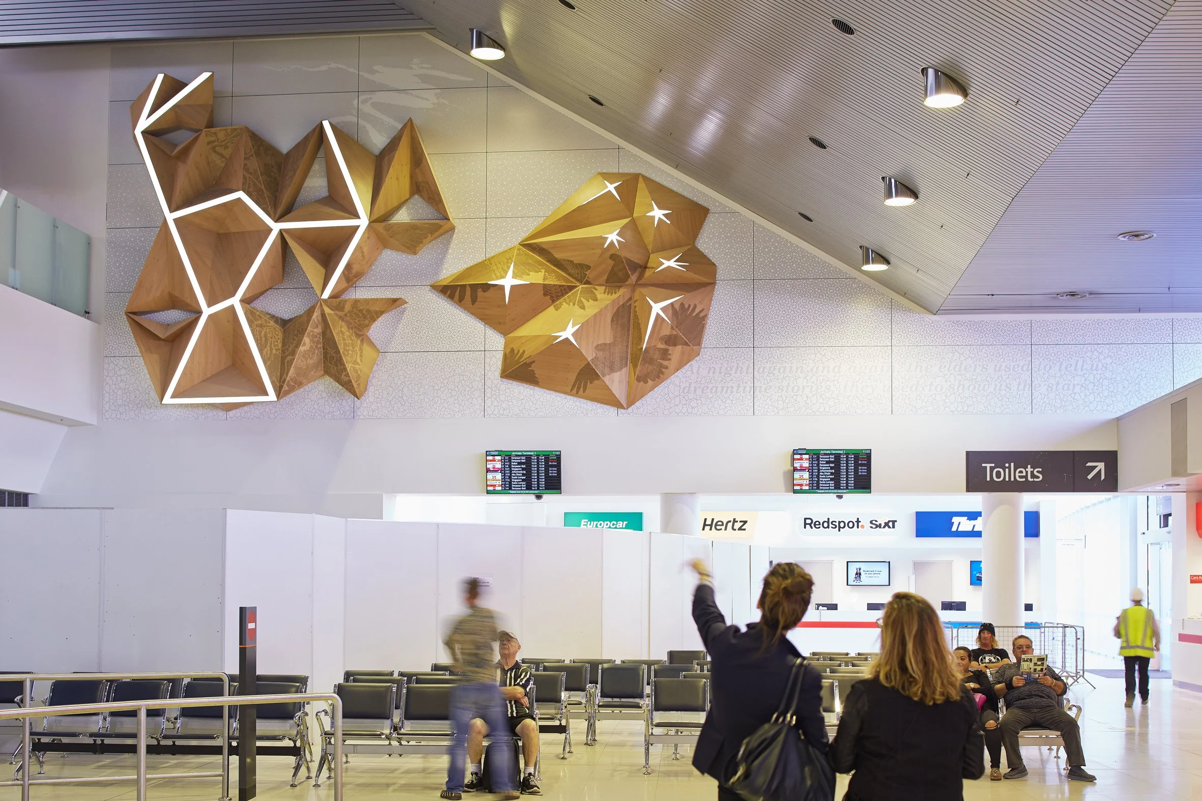 Munday Swamp, part of the Perth airport site, is one of South Western Australia's most significant archaeological sites, dating Aboriginal occupation here for at least 38,000 years. It remains a significant place for indigenous, international, and local travellers to meet and connect. This installation at the International terminal is intended to respect the origins and custodians of the land while also drawing attention to the cross-culture commonalities and connection through the celestial and terrestrial.